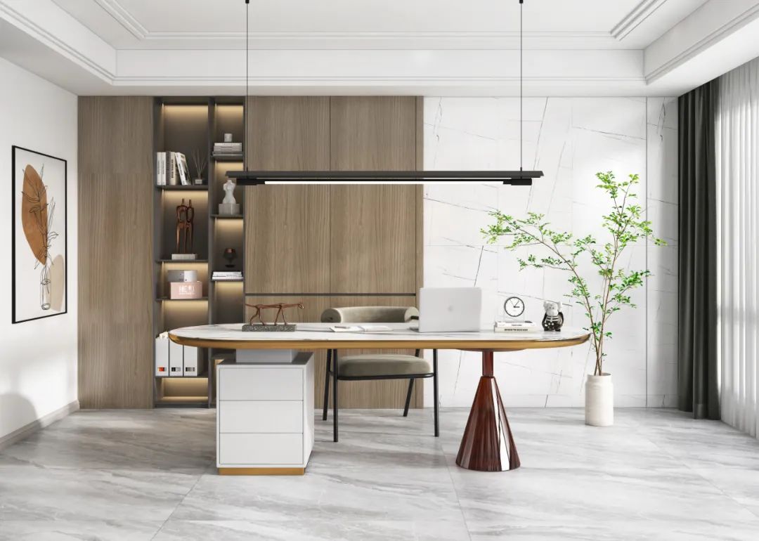 書房以虛實結合的體塊感呈現,疏密不一,個性背景墻在橫縱間碰撞交錯,演繹靈動隨性之美,踱入書房,這一隅是閱讀、辦公最好的的靜謐空間。