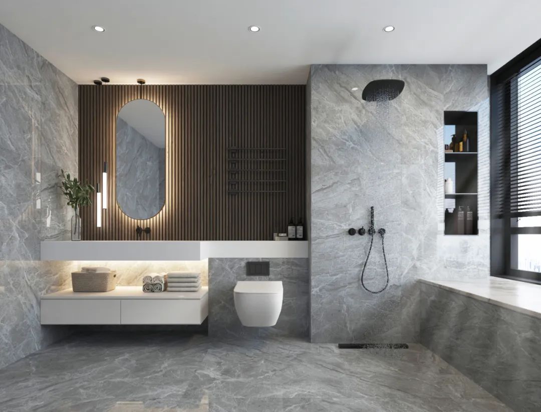 主衛(wèi)采用大面積的灰色調(diào)彰顯空間的氛圍感,也延伸了視覺(jué)感,在木色鏡子的闌珊格的加持下,讓空間的層次更加豐富,觥籌交錯(cuò)透露著品質(zhì)和追求。