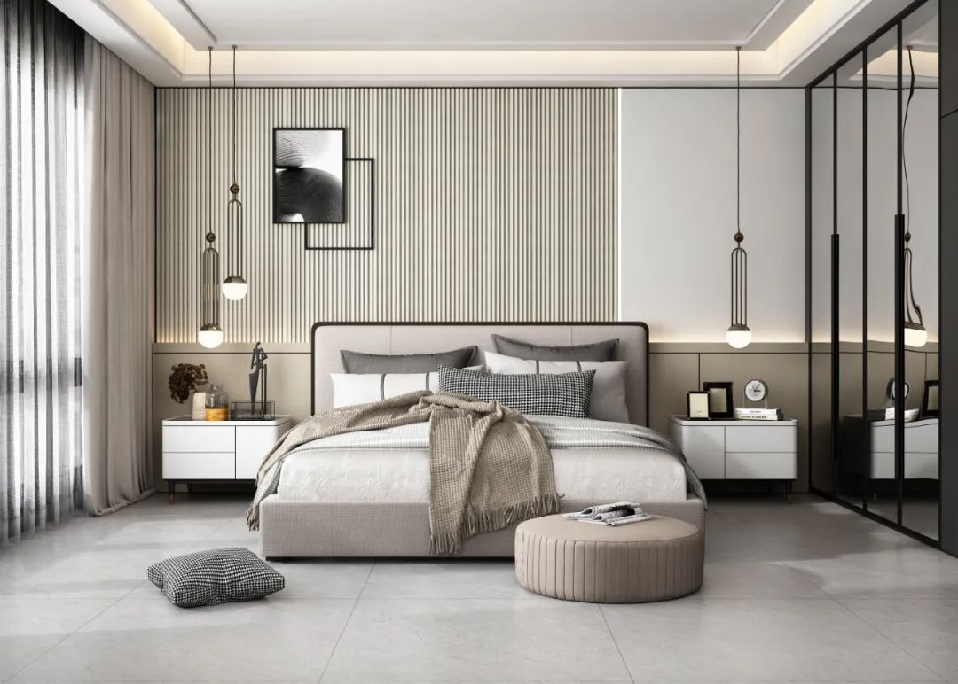 次臥以素雅精致風格打造,整體氛圍使用灰色來穩重居家調性,床頭燈和極簡墻布,都增添了相當的現代時尚感,令空間層次充實豐盈。