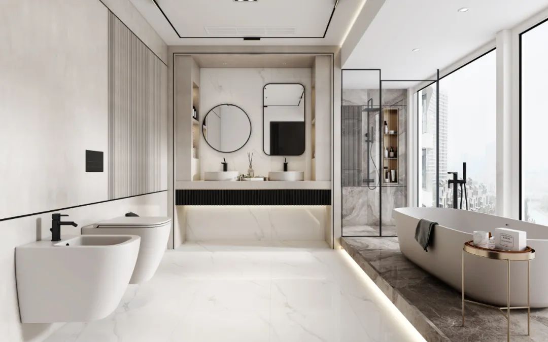 衛生間被劃分為一個大容量區域。這樣一個大區域看上去更大方美觀,灰色瓷磚與金屬質感帶來的強烈現代感被木質恰到好處的糅合,大型浴缸可以產生更快的優雅沐浴感受,主衛生間的功能分區設計十分高效暢達。