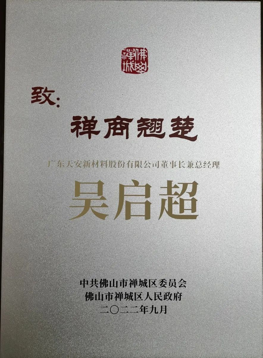 從裝飾材料--汽車內飾材料--健康人居生活,從技術創新到商業模式創新的轉變,天安新材的每次轉型,都和重視人才有關。吳啟超強調:“戰略,機制,文化是企業頂層設計,先進的頂層設計才會吸引優秀人才加盟,實現夢想,老板和職業經理人的關系必定是互相成全,相得益彰?!痹诖死砟钕拢艘淮笈鷥炐闳瞬藕秃献骰锇榧尤胩彀泊蠹彝?,天安經營業績逆勢飛揚,首次榮登2022年佛山市制造業企業100強名單。吳啟超個人榮獲2022年“禪商翹楚”稱號。