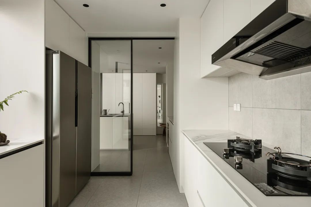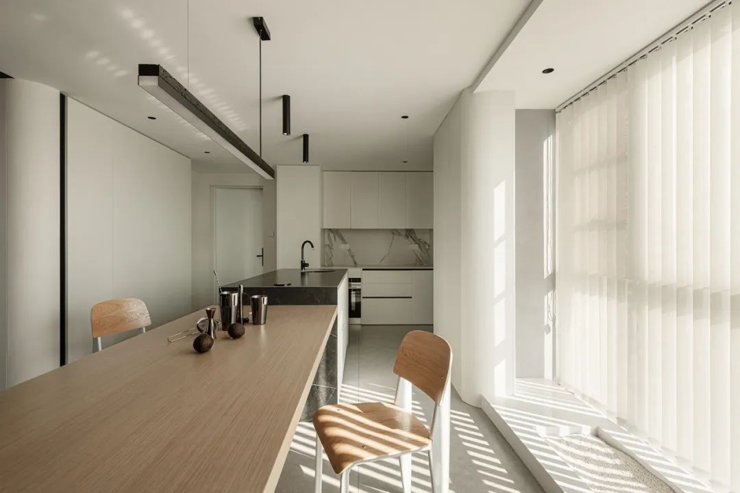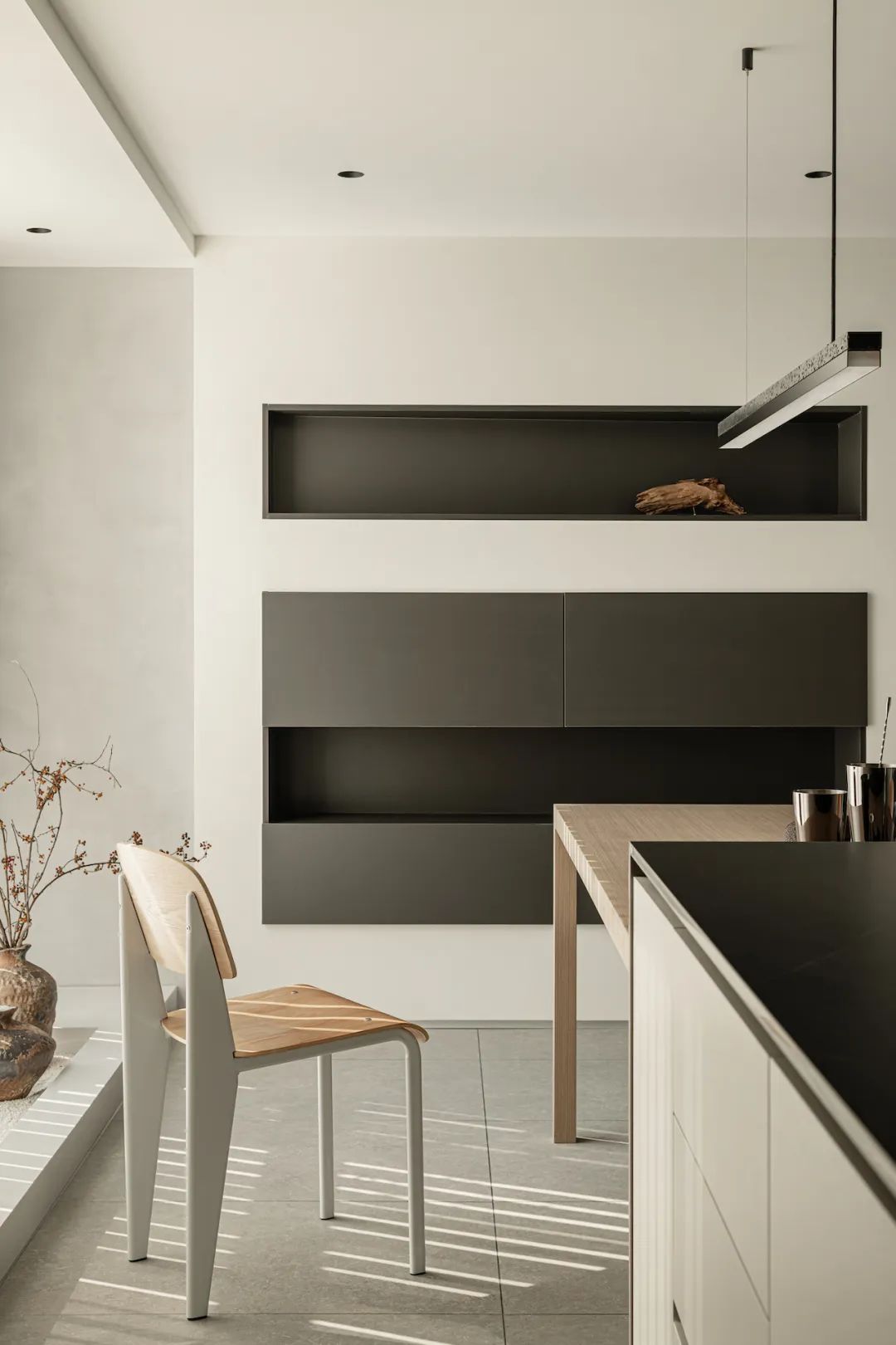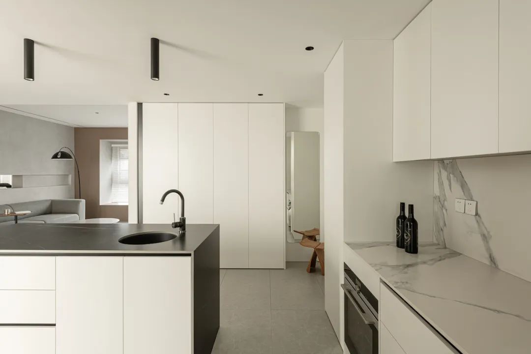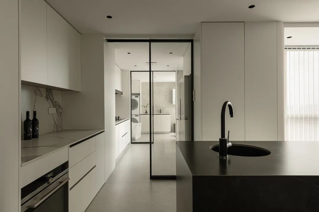 廚房的設計延續極簡的風格,白色的櫥柜與黑色島臺相搭配,兼具美觀性與實用性,細膩的紋理提升了整體空間的質感。利落的線條為空間帶來極致舒適的感受,簡潔的色彩高級又耐看。