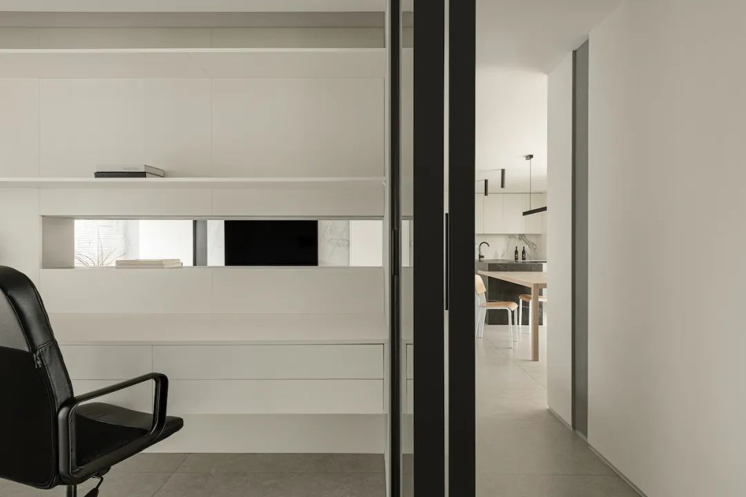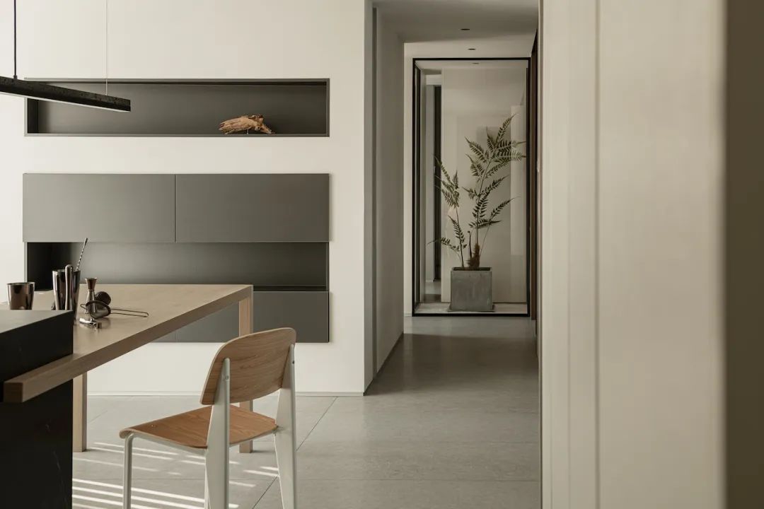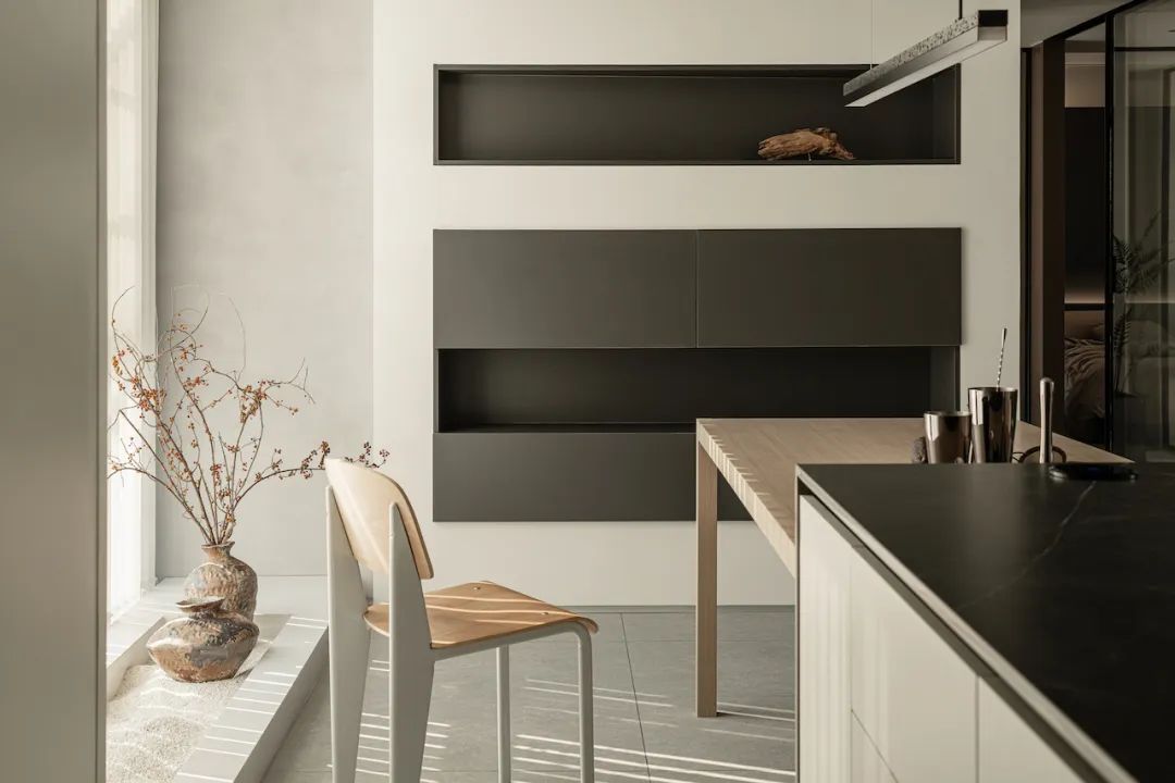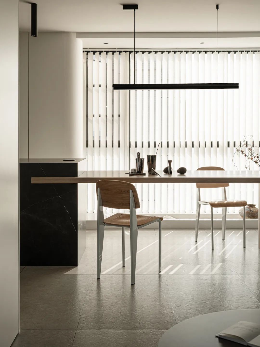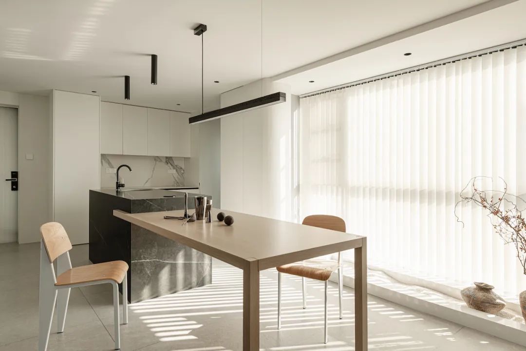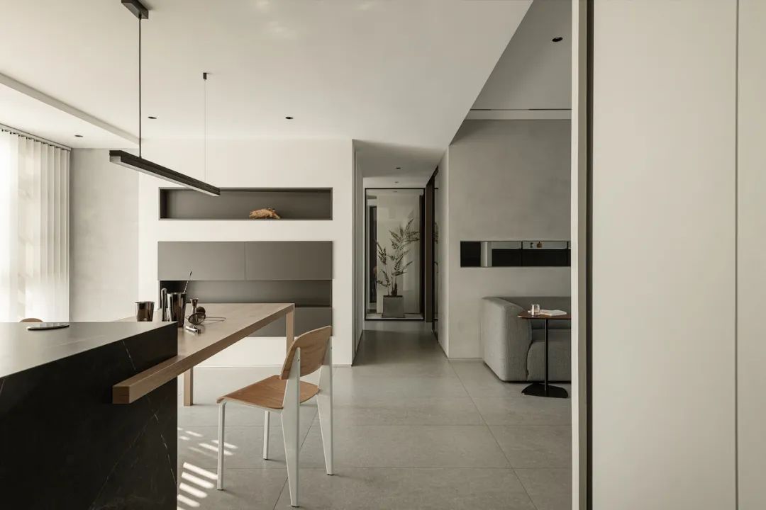 廚房的設計延續極簡的風格,白色的櫥柜與黑色島臺相搭配,兼具美觀性與實用性,細膩的紋理提升了整體空間的質感。利落的線條為空間帶來極致舒適的感受,簡潔的色彩高級又耐看。