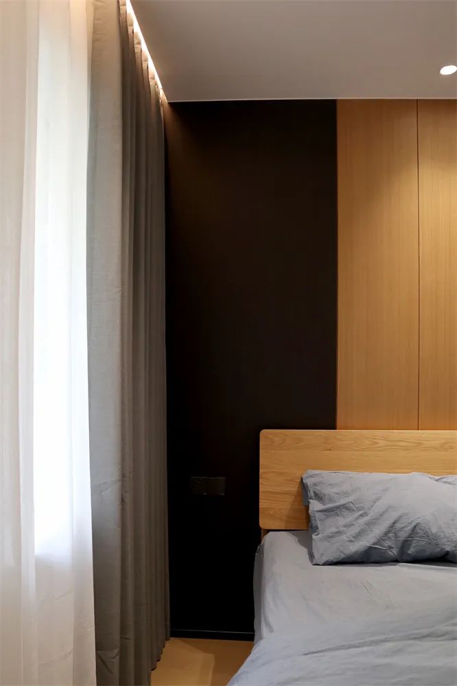 主臥沿用灰色和原木色作為空間的主色調,室內并無冗雜的設計,以簡單的居室配置打造安逸、舒適的休憩氛圍。