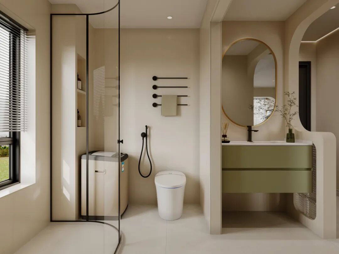 瓷磚防滑耐臟,水漬、泡沫擦后無痕,淺綠色浴室柜搭配淺灰色瓷磚,讓衛(wèi)浴間潔凈雅致。綠植點(diǎn)綴,讓洗漱沐浴都成沉浸式享受。